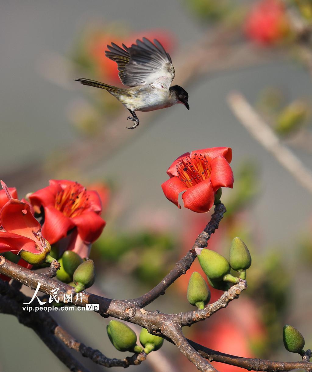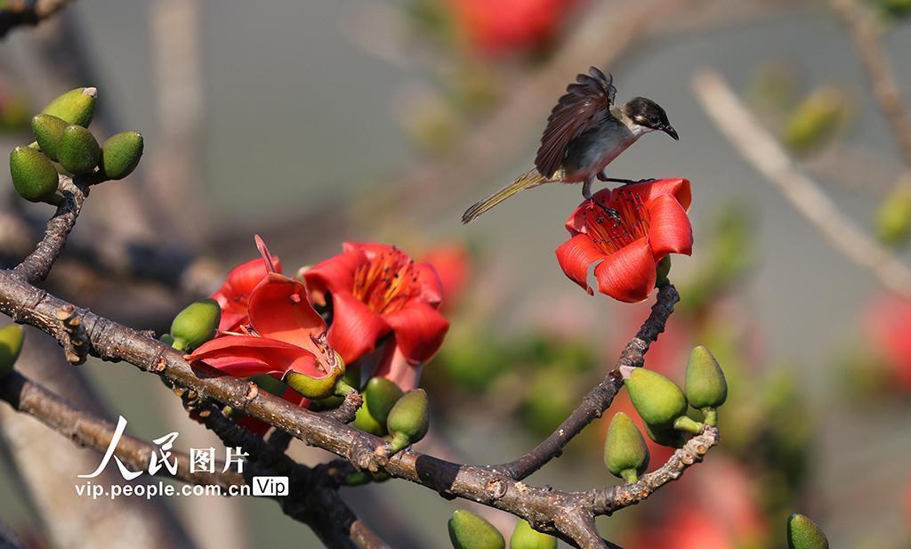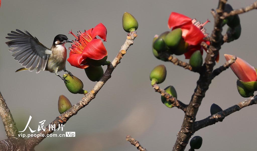 2025年2月17日,在海南三亚的南山文化旅游区内,鸟儿在绽放的木棉花丛中飞舞、觅食。陈文武摄(人民图片网)
